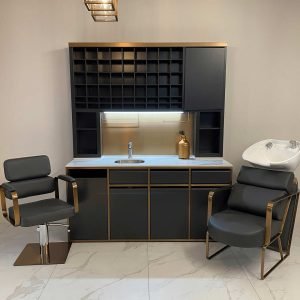 • The Obsidian Luxe stands out with its elegant Charcoal and Copper finish, adding a refined and modern touch to any salon interior. The White Natural Stone marble-effect worktop provides a high-end look while also offering a durable surface that’s ideal for color mixing and tool placement.