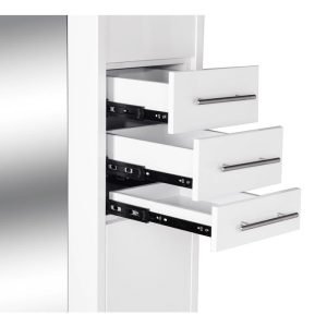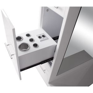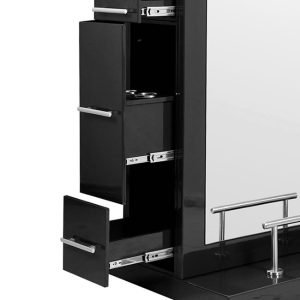 • The PrismEdge Styling Station offers a range of storage options to meet the diverse needs of professional stylists. It includes four spacious drawers for small tools and products, a cabinet with an adjustable shelf for larger items, and a pull-out blow dryer holder. This setup ensures that all your essential items are within reach, helping you maintain a tidy and efficient workspace.